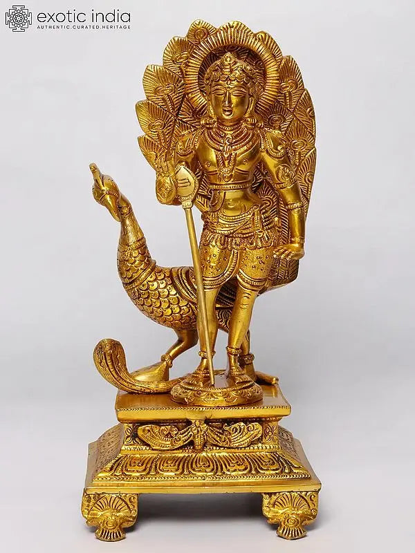 From the Hindu Gods & Goddesses collection in our Sculptures category, this is 12" Lord Murugan Statue (Karttikeya) Standing on Pedestal with Peacock. Item specifications: Brass Statue | 12.00 inch Height X 5.50 inch Width X 5.50 inch Depth | 4.04 kgKumara-the ever-youthful divine son of Shivaand Parvati is enlivening this handmade pure brass statue,appearing in the manner of a celestial prince and commander of Indras army,Devasena. A