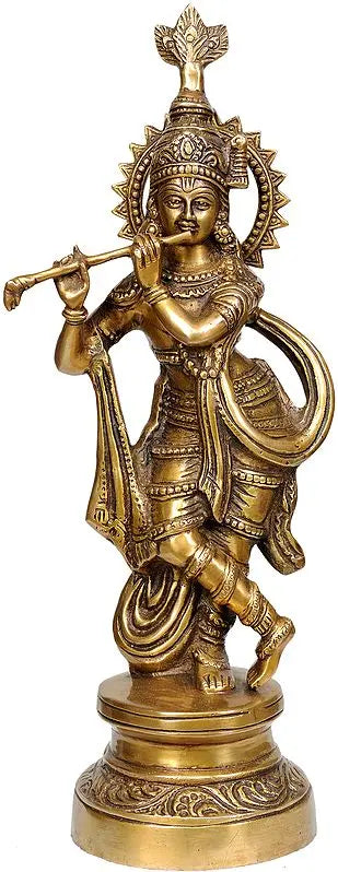 Details for 16" Murli Krishna Brass Statue | Handmade | Made in India which belongs to the Krishna category in our Sculptures collection: Brass Statue | 16 inch X 6 inch X 4 inch | 3.60 kgMurli Krishna is a form of the Hindu god Krishna, often depicted as a young child holding a flute (a "murli" in Hindi). This portrayal highlights Krishna's mischievous and playful nature, as well as h