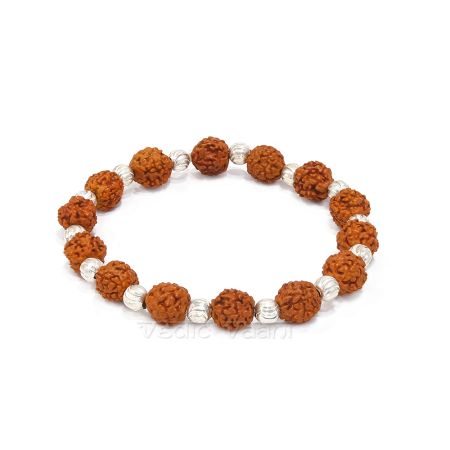 Rudraksha bracelet made of 14 beads of five (5) mukhi small rudraksha with artificial silver spacers in adjustable thread. Wearing a Rudraksha bracelet you can feel energise yourself.