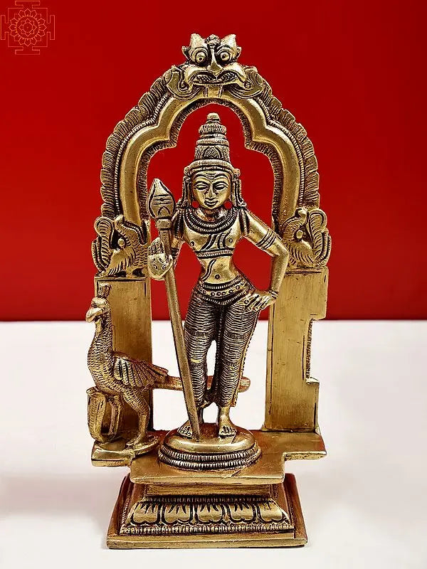 Details for 7" Lord Kartikeya Sculpture | Murugan Brass Statue | Handmade which belongs to the Small Sized Statues category in our Sculptures collection: BRASS | 7.50 inch Height X 3.90 inch Width X 3.00 inch Depth | 920 gmIn this brass rendition, Kartikeya, alsoknown as Murugan, stands in the Tribhanga Pose, on a majestic Kirtimukhathrone. His left-hand rests confidently on his waist, radiating an aura