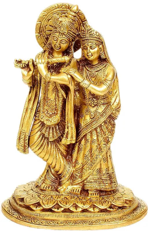 This is 7" Radha Krishna | Religion is Love | Brass | Handmade | Made In India from the category Krishna in our Sculptures collection. Details for this item: Brass Sculpture | 7.5 inch X 5 inch X 3.5 inch | 1.50 kgIn Vrindavana, it is considered incorrect for Krishna to be worshipped in the absence of Radha or she in his. It expresses the conviction that religion is love - that is what Radha and Krishna represe