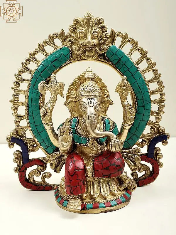 9" Richly Inlaid Ganesha Shrine Brass Sculpture | Handmade | Made in India