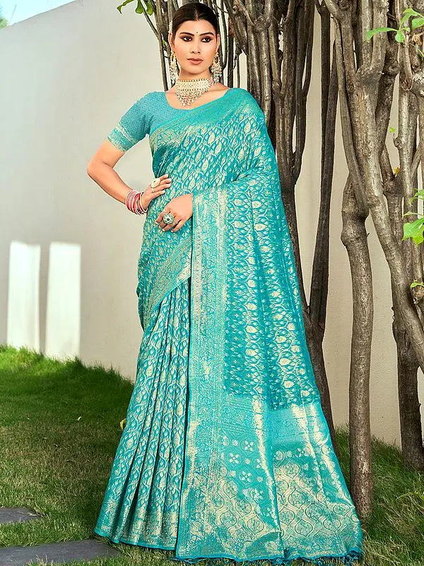 Beautiful Leaf-Patterned Cotton Saree With Tassels And Blouse