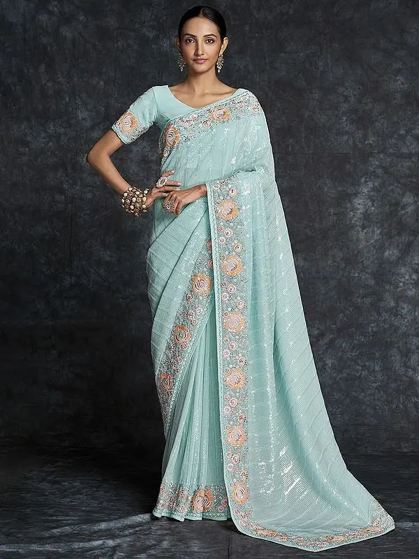 Georgette Pinstripe Pattern Thread-Sequins Heavy Embroidered Saree with Meena Floral Border