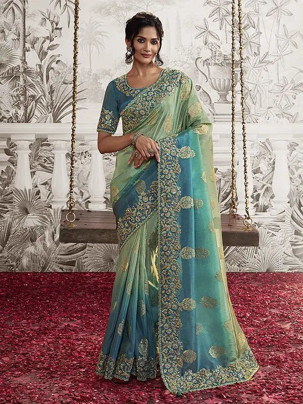 Green-Blue Zari Embroidered Stone Sequins Pure Viscose Tissue Jacquard Saree with Blouse