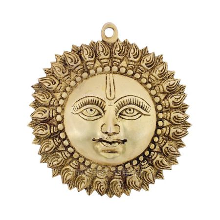 Lord Surya (Sun) Mukh (face) Wall Hangingmade in brass metal, it issymbolising day with sun. Surya is considered as the only visible form of God that can be seen every day. God Surya is regarded as an aspect of Shiva and Vishnu by Shaivites and Vaishnavas respectively. Surya is also known as Surya Narayana.