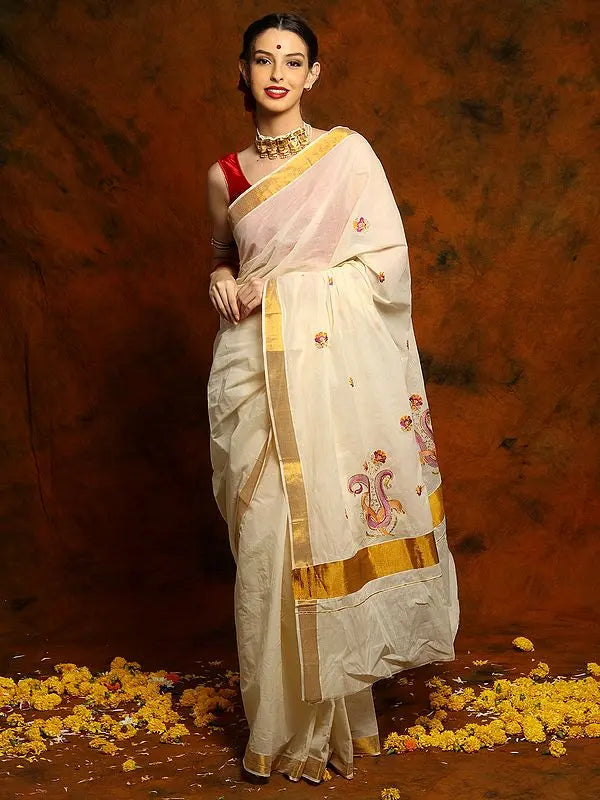 Off White Onam Saree with Golden Border and Traditional Sequined
